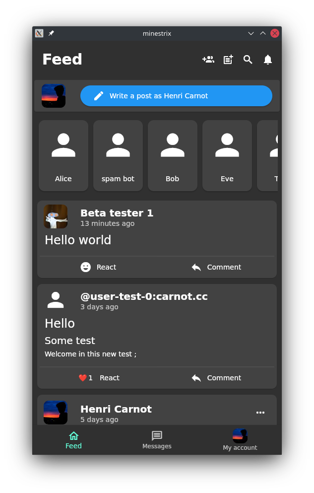 The most exciting thing is the new trixnity-client module. It provides a high level client implementation and allows you to easily implement clients for Desktop, Mobile and Web. You just need to render data from and passing user interactions to Trixnity. The key features are: