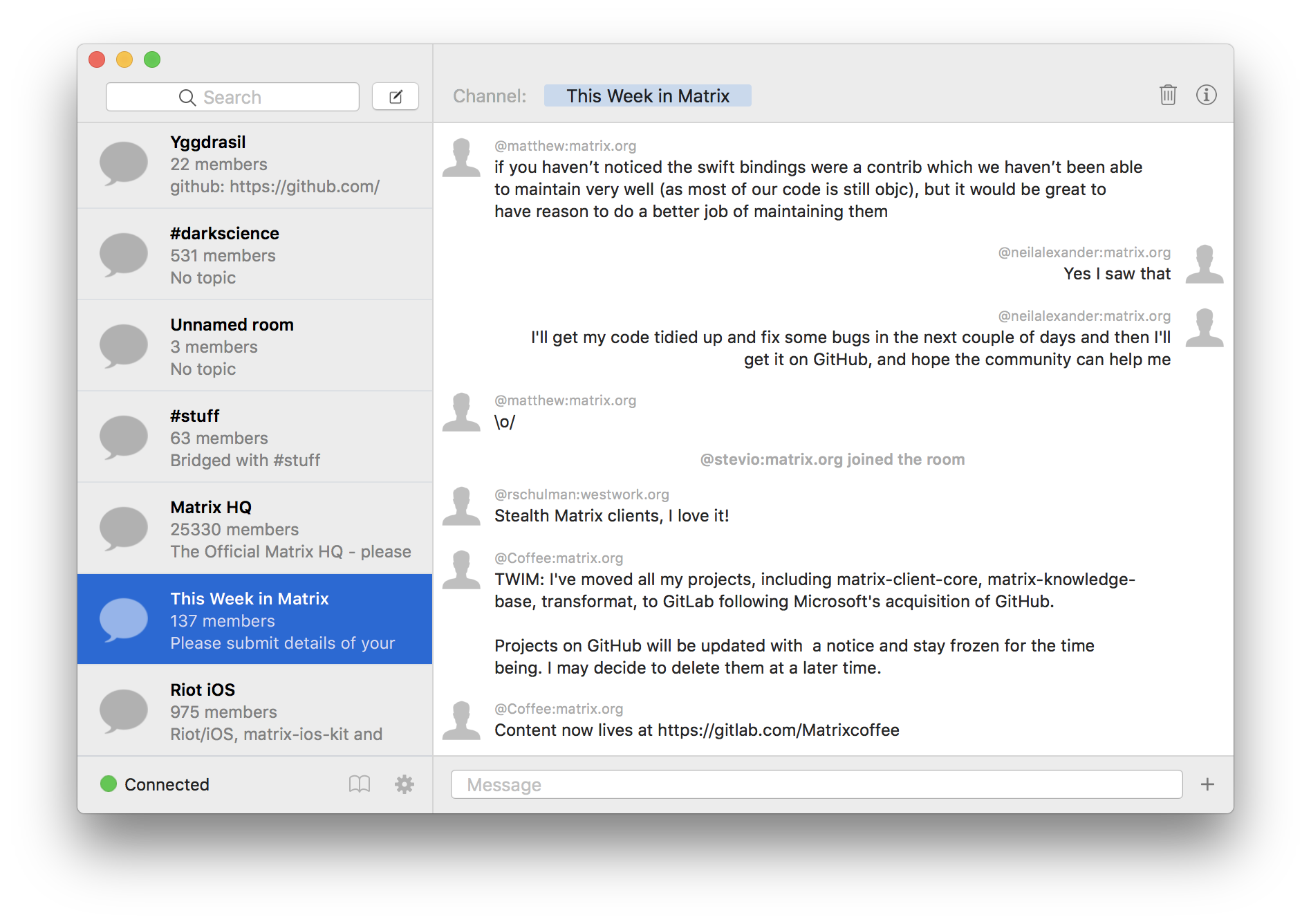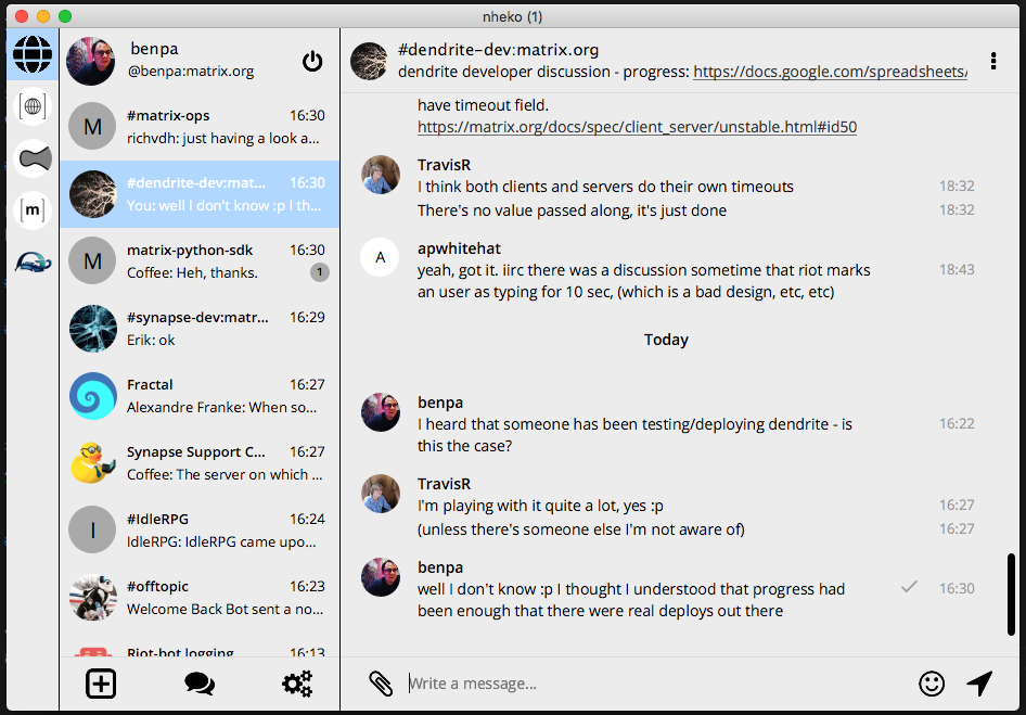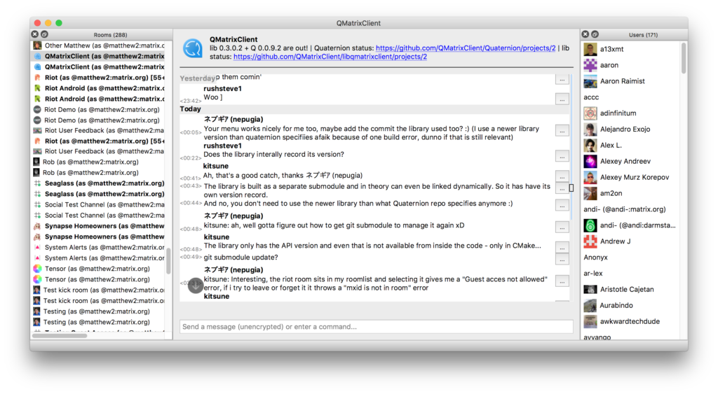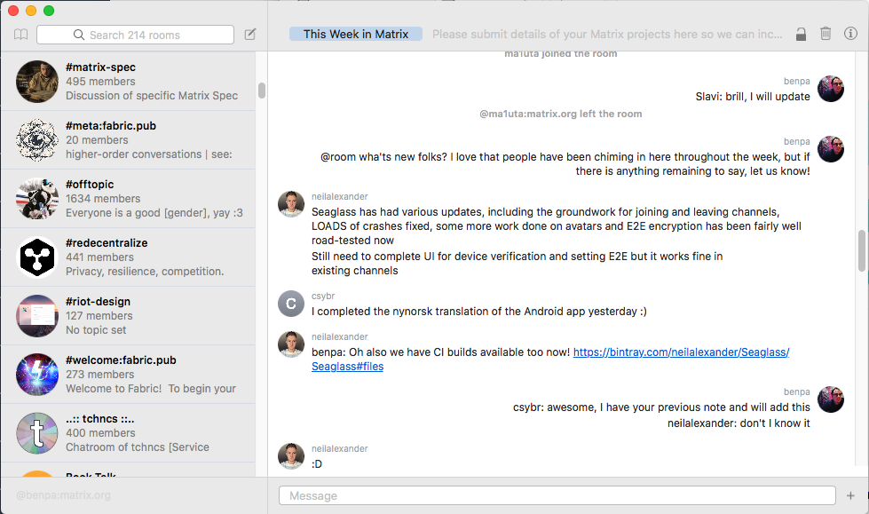 Seaglass has had various updates, including the groundwork for joining and leaving channels, LOADS of crashes fixed, some more work done on avatars and E2E encryption has been fairly well road-tested now Still need to complete UI for device verification and setting E2E but it works fine in existing channels