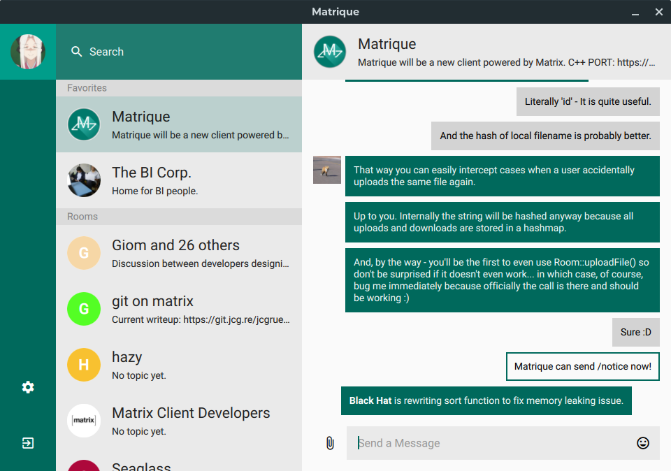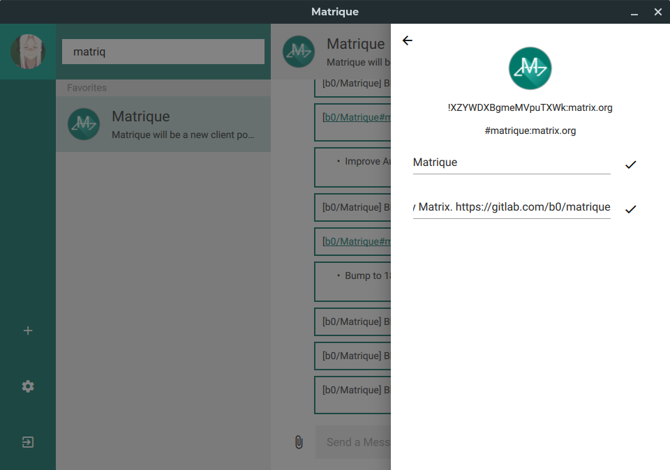 Matrique now has a (basic) room management panel, a working emoji picker, an unread marker and supports playing "m.audio". It should be available at Flathub any time.