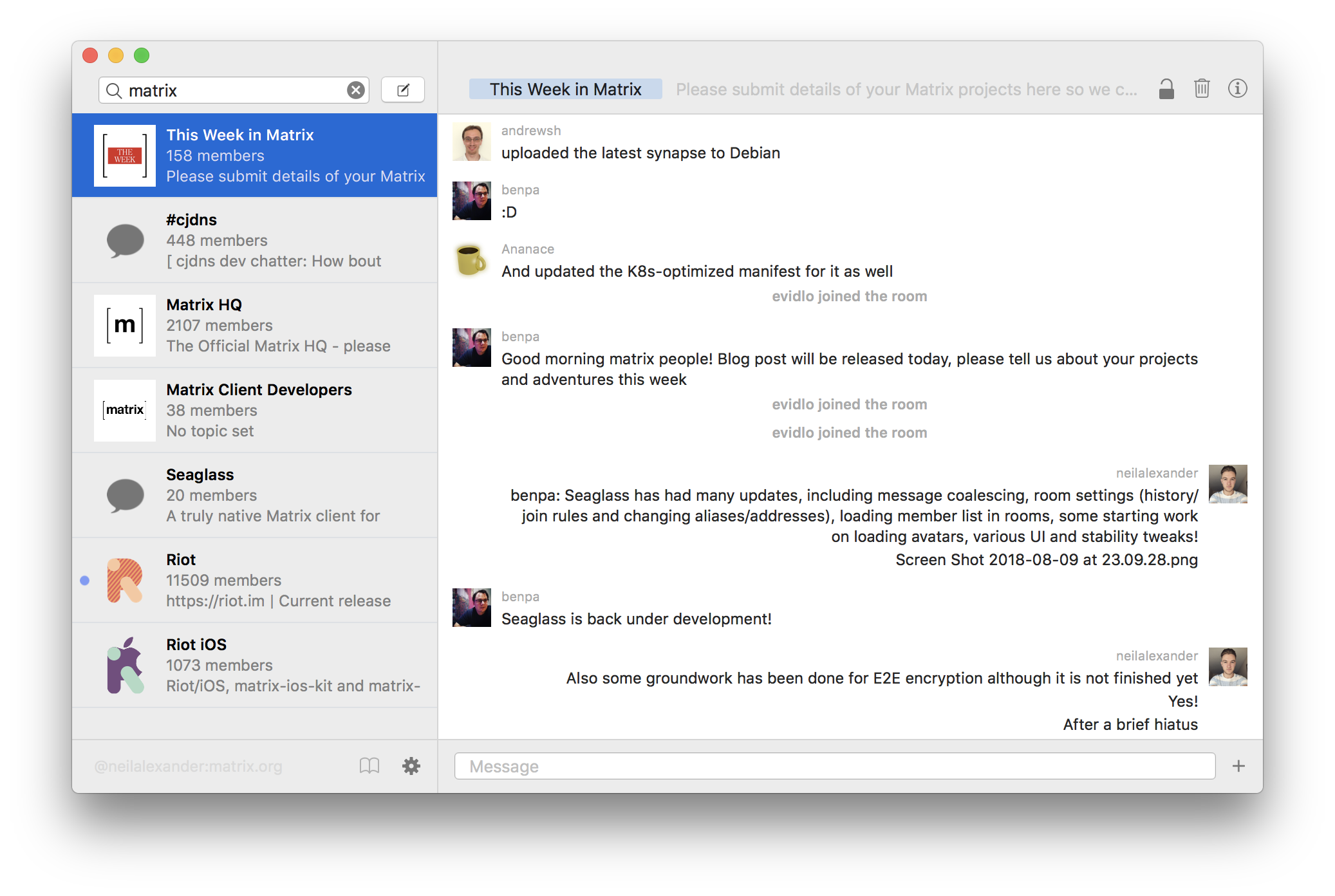 Seaglass has had various updates, including the groundwork for joining and leaving channels, LOADS of crashes fixed, some more work done on avatars and E2E encryption has been fairly well road-tested now Still need to complete UI for device verification and setting E2E but it works fine in existing channels